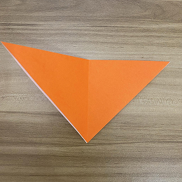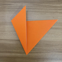 右側の三角の辺を中央に向かって折りますが、完全には折りません。