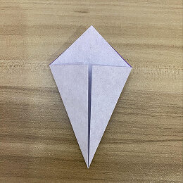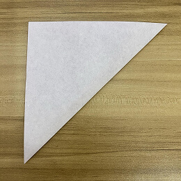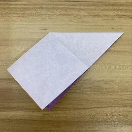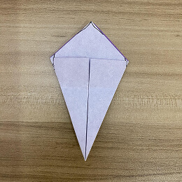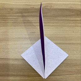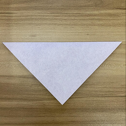 三角形を半分に折ります。左の角を右の角に合わせて折ってください。