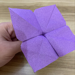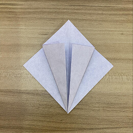 左のフラップを縦に立ててから、開いてつぶすように折ってください。