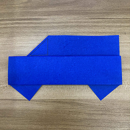 下のフラップの右側を斜めに折り下げます。これが車輪になります。