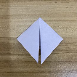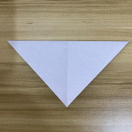 正方形の紙を平らに置き、三角形になるように対角線で折ります。その後、開きます。