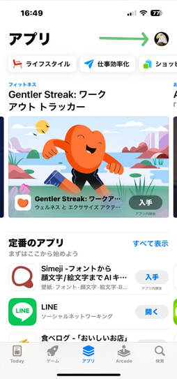 画面の上部にあるプロフィールアイコンをタップします。