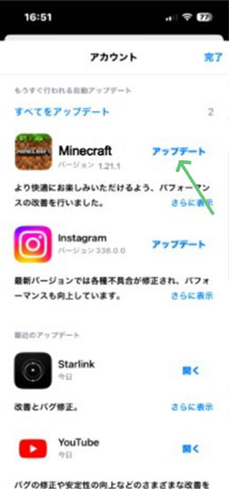 下にスクロールして、保留中のマインクラフトアップデートやリリースノートを確認します。その横の「アップデート」をタップします。(アップデートが無い場合は、ここに表示されません。)