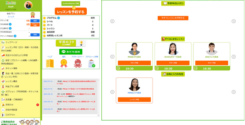 このページでは、マイページへのログイン方法についてご案内いたします。 マイページでは、レッスンの予約やキャンセルはもちろん、 ご自身の受講状況に関するさまざまな情報をご確認いただけます。 あなただけの特別なページとなっておりますので、マイページの機能を活用して、 有意義で楽しい英会話ライフをお楽しみください!