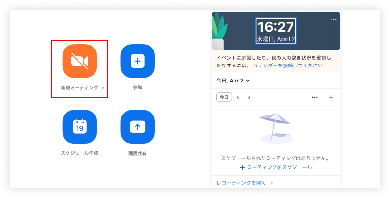 予約(よやく)したレッスンの時間(じかん)5分前になったらZoomのアプリを開(ひら)き、「新規(しんき)ミーティング」を選択して先生(せんせい)が来(く)るのを待(ま)ちましょう。